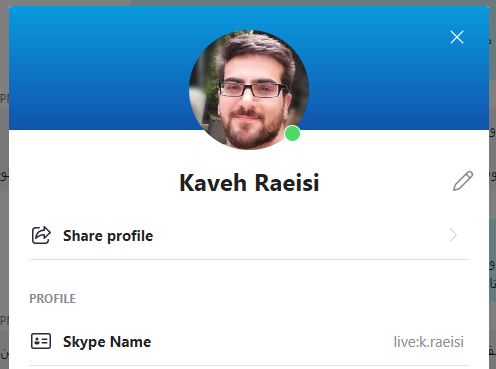 پس از نصب نرم افزار اسکایپ، با جستجوی آیدی بنده به نام k.raeisi، تصویر زیر را مشاهده خواهید کرد. لطفاً یک پیام برای من بگذارید تا بتوانیم ارتباط برقرار کنیم.